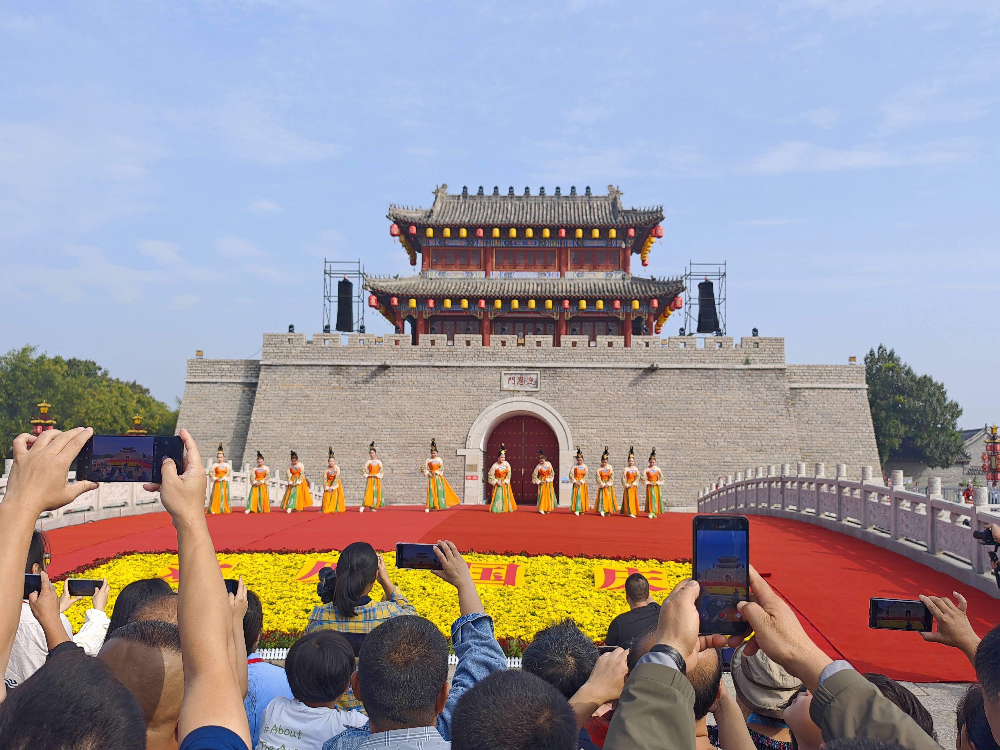 10月1日上午9时许,阵阵浑厚的擂鼓声中,无棣古城的南门迎恩门前,上演了一场隆重的迎宾礼:演员穿着古装,用武术和舞蹈迎接宾客。